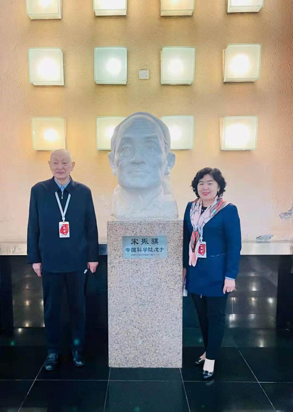 宋院士在母校为其立筑的杰出校友碑前合影