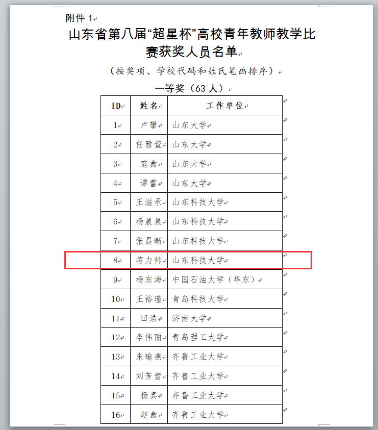 据悉,山东省青年教师教学比赛是省内高校规模最大、水平最高的青年教师教学类竞赛,一等奖中优秀者将遴选参加两年一度的全国高校青年教师教学比赛。赛事设立文科、理科、工科、医学四个组别,共有来自全省142所高校的616名教师经校级选拔赛推选参加,经过省级初赛、复赛、决赛,最终决出一等奖63名。