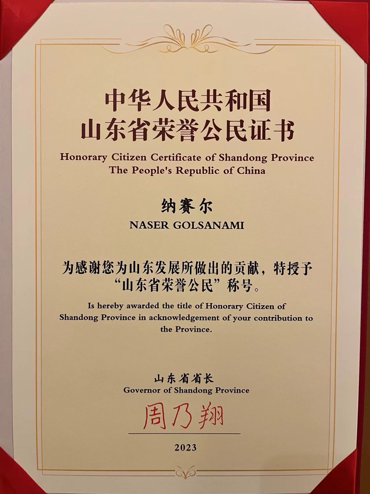 yl34511线路中心伊朗籍专家纳赛尔获“山东省荣誉公民”称号