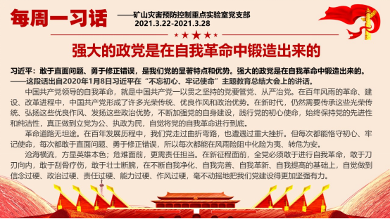 每周发送在党支部微信群中,促进支部党员了解金句的出处及含义,挖掘金句内涵、弘扬金句价值,成为学懂、弄通、做实习近平新时代中国特色社会主义思想的基层党员先锋。