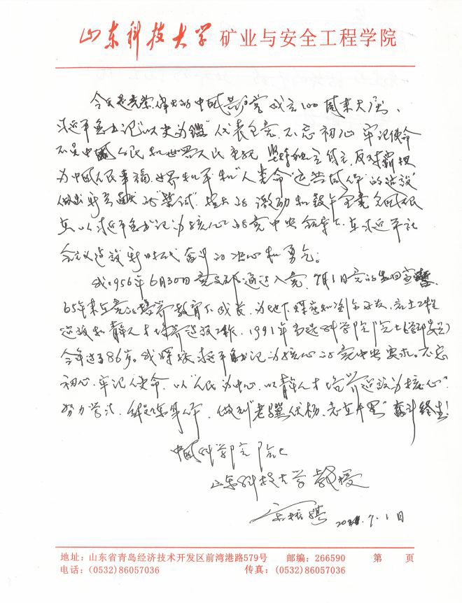 重点yl34511线路中心党支部老党员86岁高龄、65岁党龄的宋振骐院士收看大会实况直播后,亲笔书写感想心得,表达对党的事业奋斗终生的拳拳之心,宋院士写道:今天是光荣、伟大的中国共产党成立100周年大庆,习近平总书记“以史为鉴”,代表全党不忘初心、牢记使命,不负中国人民和世界人民重托,坚持独立自主,反对霸权,为人民幸福、世界和平和“人类命运共同体”的建设做出新贡献的“誓词”极大地激励和鼓舞全党全国人民在以习近平同志为核心的党中央领导下,在社会主义建设中建设新时代奋斗的决心和勇气。我1956年6月30日入党,在7月1日党的生日当天宣誓。65年来在党的培养教育下成长,为地下煤炭和资源开发、岩土工程建设和青年人才培养建设工作。1991年当选为科学院院士(学部委员),今年过了86岁。我将按以习近平同志为核心的党中央要求,不忘初心,牢记使命,以“人民为中心,以青年人才培养建设为核心”,努力学习,锻炼身体,做到“老骥伏枥,志在千里”,奋斗终生!